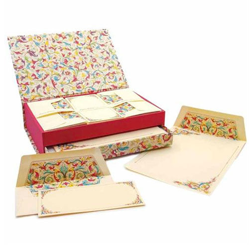 קופסה זו מכילה אוסף של פריטי נייר מכתבים משובחים, המעוטרים כולם בדפוסים עשירים ומסורתיים ובסמלי זהב מרהיבים.