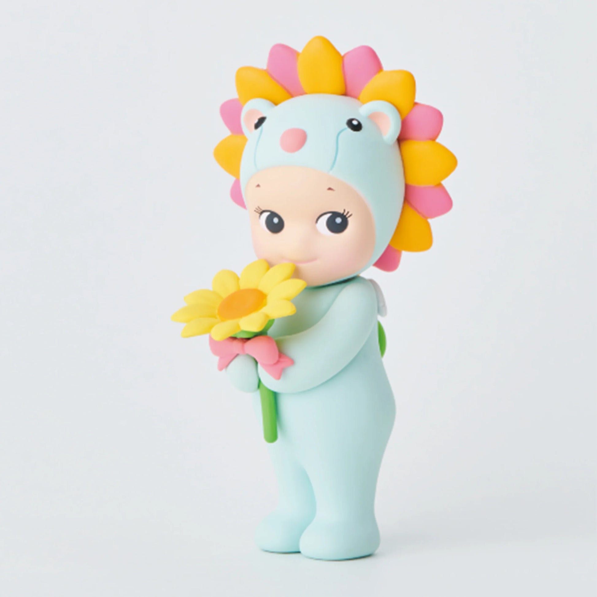 6 מלאכים מתוקים בדמות אריה לבושים בבגדים צבעוניים ואוחזים בפרחים שונים - חמנייה, ורד וחרצית, מוכנים ומצפים להעניק אותם במתנה.